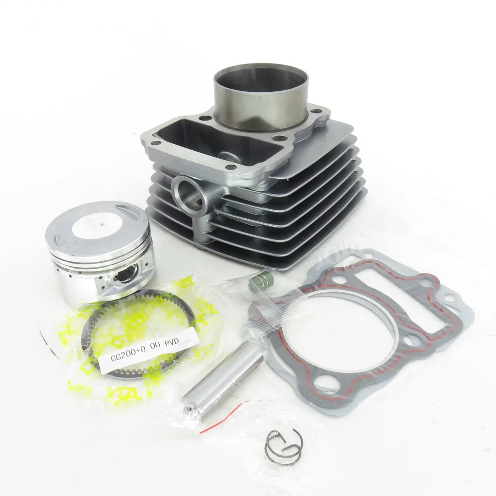 - Циліндр: Виготовлений з високоміцного алюмінієвого сплаву з інтегрованою чавунною гільзою. Таке поєднання матеріалів забезпечує відмінне тепловідведення, стійкість до високих температур і механічних навантажень, а також виняткову зносостійкість робочої поверхні. Діаметр циліндра становить 63.5 мм, що відповідає стандартним розмірам двигунів CG200. Точне хонінгування внутрішньої поверхні гарантує ідеальне прилягання поршневих кілець, мінімальне тертя та ефективне утримання мастила для змащення.
