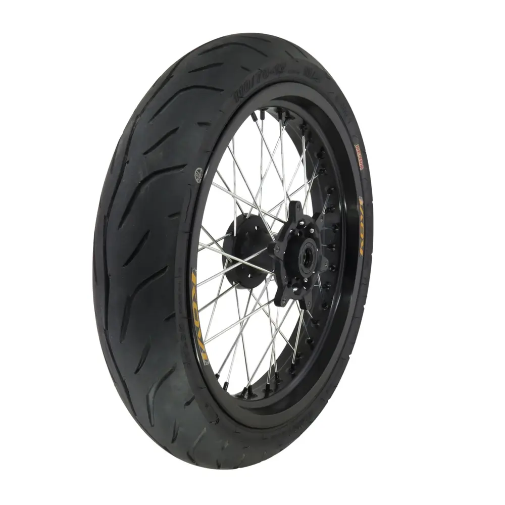Передній диск цього комплекту – це зразок міцності та елегантності. Виготовлений з високоякісних сплавів, він забезпечує оптимальне співвідношення між легкістю та стійкістю до навантажень. Чорне матове покриття не тільки надає мотоциклу агресивного та сучасного вигляду, але й має додаткову стійкість до корозії та дрібних подряпин. Диск розміром 3,00J x 17 дюймів розроблений для забезпечення ідеального балансу, що є критично важливим для стабільності на високих швидкостях та точності керування. Його конструкція враховує всі особливості динамічних навантажень, які виникають під час гальмування та проходження поворотів, гарантуючи максимальну надійність та довговічність. Завдяки ретельному контролю якості на всіх етапах виробництва, кожен диск KOVI відповідає найвищим стандартам, забезпечуючи відмінну продуктивність та безпеку на дорозі. Продумана геометрія диска також сприяє ефективному відведенню тепла від гальмівної системи, що особливо актуально при інтенсивній експлуатації.