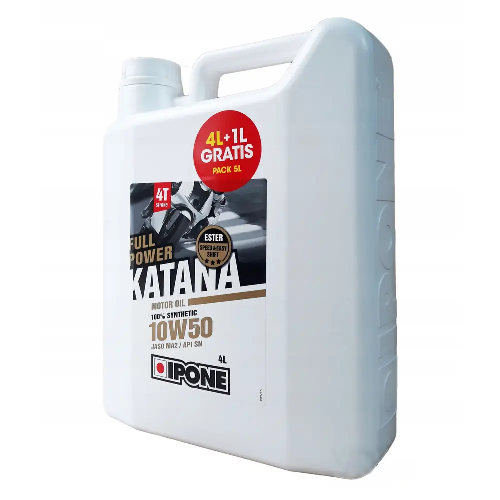 Для справжніх поціновувачів мотоциклетної техніки, які прагнуть забезпечити своєму двоколісному другу максимальний захист та бездоганну продуктивність, Motomarket пропонує преміальне моторне масло IPONE Full Power Katana 10W50. Цей продукт є втіленням передових технологій у галузі мастильних матеріалів, розроблених спеціально для високопродуктивних чотиритактних двигунів мотоциклів. Об'ємна упаковка 4 літри плюс додатковий 1 літр дозволяє зручно та економічно провести повну заміну масла, або мати запас для доливів, забезпечуючи спокій та впевненість на довгі дистанції.