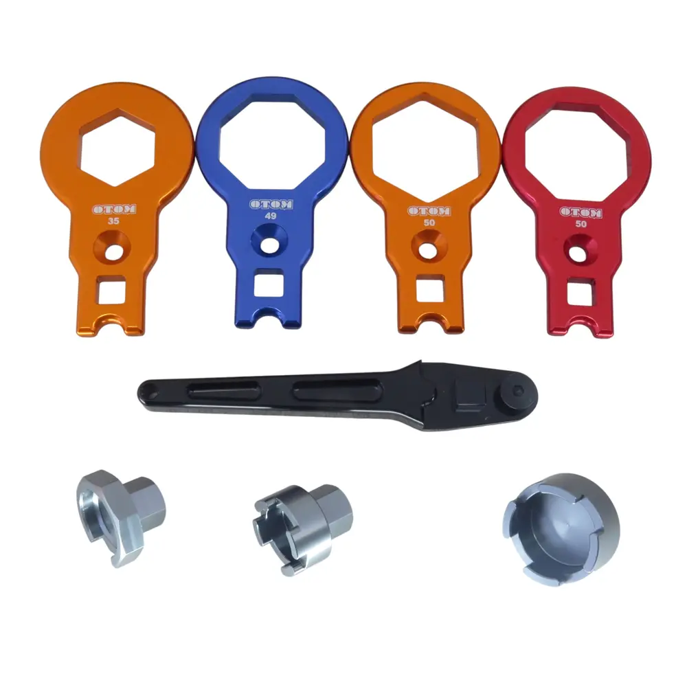 Набір "OTOM" є високоякісним рішенням, розробленим для полегшення та підвищення ефективності робіт з передніми амортизаторами мотоциклів. Він включає спеціальний ключ та втулку, призначені для точного та безпечного розбирання та збирання вилки. Ці компоненти розроблені для роботи з вилками певних розмірів, що забезпечує ідеальне прилягання та мінімізує ризик пошкодження деталей під час обслуговування.