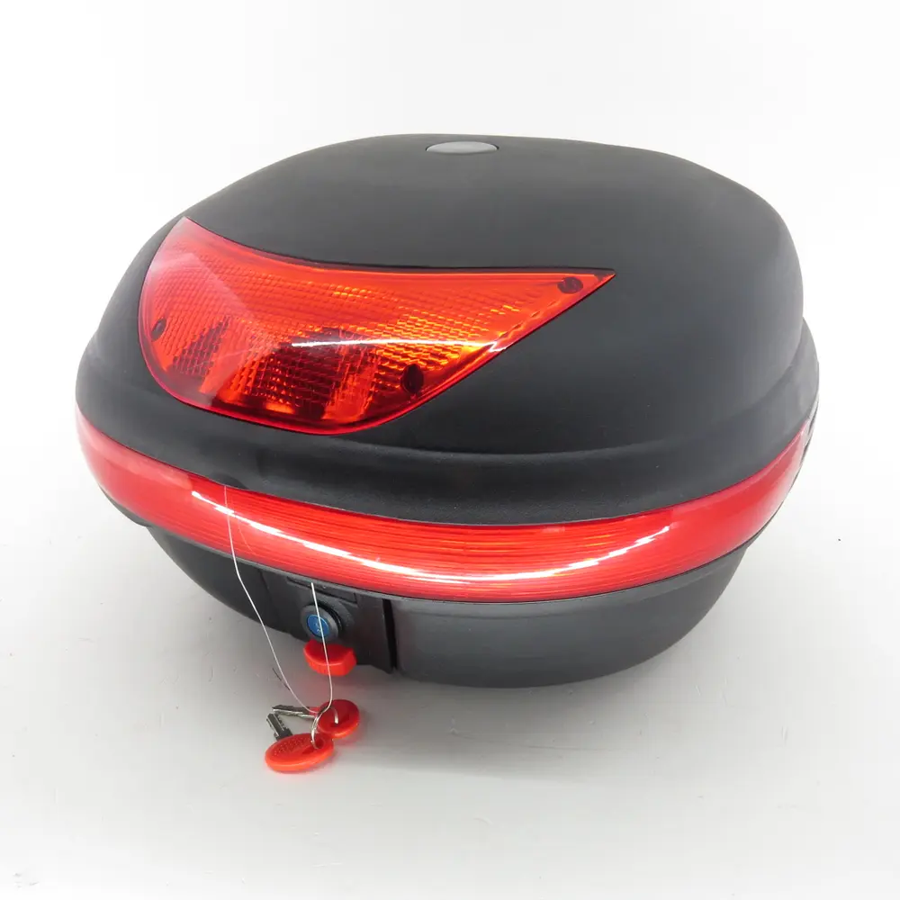 - Аеродинамічний дизайн та безпека: Плавні лінії та продумана форма кофра не створюють зайвого опору повітрю під час руху, що позитивно впливає на керованість та витрату палива. На задній частині корпусу інтегрований великий червоний світловідбивач, який значно підвищує вашу помітність на дорозі в темний час доби та в умовах поганої видимості, роблячи поїздки безпечнішими.