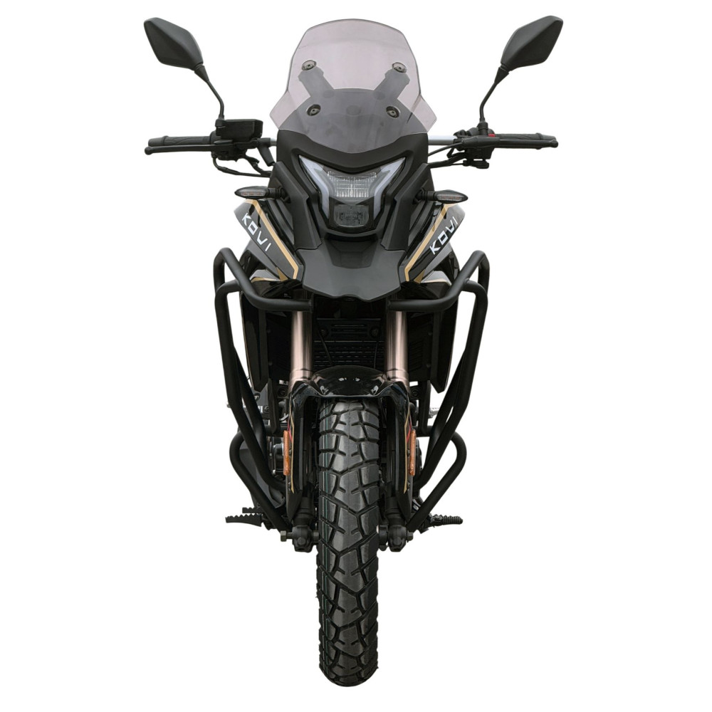 Безпека є пріоритетом для KOVI ADV 300. Мотоцикл оснащений надійною гальмівною системою з дисковими гальмами як спереду, так і ззаду, що забезпечує впевнене та контрольоване уповільнення в будь-яких умовах. Міцна сталева рама гарантує високу жорсткість конструкції та надійний захист для райдера. Якісні шини з універсальним протектором забезпечують відмінне зчеплення з дорогою на асфальті та достатню прохідність на легкій ґрунтовці. Кожен компонент KOVI ADV 300 розроблений з урахуванням найвищих стандартів безпеки, щоб ви могли повністю зосередитися на дорозі та насолоджуватися поїздкою, маючи повну впевненість у своєму транспортному засобі. Додаткові елементи захисту двигуна та шасі дозволяють впевнено долати навіть складні ділянки бездоріжжя.