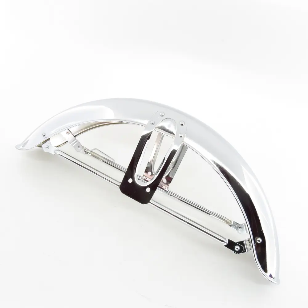 Основна функція переднього крила – це забезпечення ефективного захисту. Воно надійно оберігає водія, двигун та інші критично важливі компоненти мотоцикла від бруду, води, каміння та інших дорожніх забруднень, що неминуче викидаються переднім колесом під час руху. Цей захист є особливо актуальним під час поїздок у складних погодних умовах, на мокрих дорогах або по трасах з неякісним покриттям, де ризик потрапляння сторонніх предметів значно зростає. Представлене крило виготовлене з високоміцних матеріалів, які гарантують виняткову стійкість до механічних пошкоджень, вібрацій та деформацій, що є типовими для інтенсивної експлуатації мотоцикла. Хромоване покриття не тільки додає естетичної привабливості, але й значно підвищує корозійну стійкість металу. Воно створює надійний бар'єр проти іржі, окислення та агресивного впливу зовнішнього середовища, включаючи вологу, дорожні реагенти та ультрафіолетове випромінювання. Завдяки цьому крило зберігатиме свій бездоганний вигляд і функціональність протягом тривалого терміну експлуатації, незалежно від інтенсивності використання мотоцикла та складності умов експлуатації.