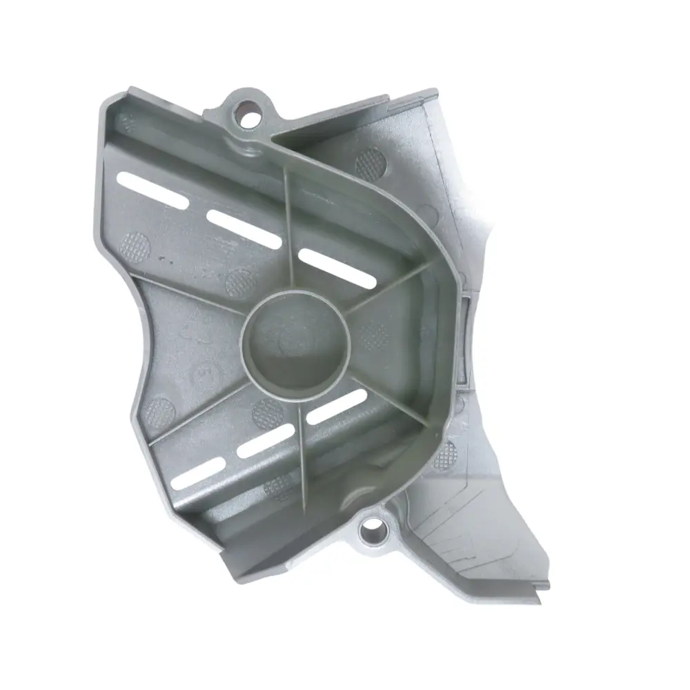 При виготовленні кришки передньої зірки використовуються міцні та стійкі до корозії матеріали, здатні витримувати значні механічні навантаження, постійну вібрацію та вплив агресивного середовища, такого як волога, бруд, хімічні реагенти. Зазвичай, для таких компонентів застосовують високоякісні сплави алюмінію або міцні та стійкі до ударів полімери, які забезпечують оптимальне поєднання легкості, міцності та довговічності. Поверхня кришки часто покривається спеціальними захисними шарами або фарбою, що не тільки покращує її естетичний вигляд, але й додатково захищає від подряпин, відколів та корозії. Продумана конструкція забезпечує ефективне відведення тепла та запобігає перегріву вузлів трансмісії.