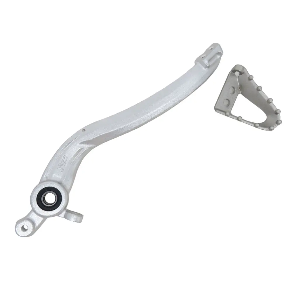 Модель KOVI NC250-4Т PRO відома своєю здатністю долати виклики бездоріжжя, і її компоненти повинні відповідати цьому рівню вимог. Представлена лапка заднього гальма створена саме для таких умов. Вона має посилену конструкцію, здатну витримувати значні ударні навантаження, які неминучі при падіннях або зіткненнях з перешкодами на трасі. Її дизайн забезпечує оптимальне положення для ноги водія, дозволяючи швидко і комфортно використовувати гальмо, не відволікаючись від дороги. Оснащена агресивною, але ергономічною платформою, що мінімізує зісковзування ноги навіть у брудних або мокрих умовах. Інтегрована складана насадка лапки (тип "гармошка") є важливою перевагою для позашляхових мотоциклів, оскільки вона захищає компонент від поломки під час падінь, дозволяючи насадці згинатися і повертатися у вихідне положення, зменшуючи ймовірність пошкодження всієї системи.