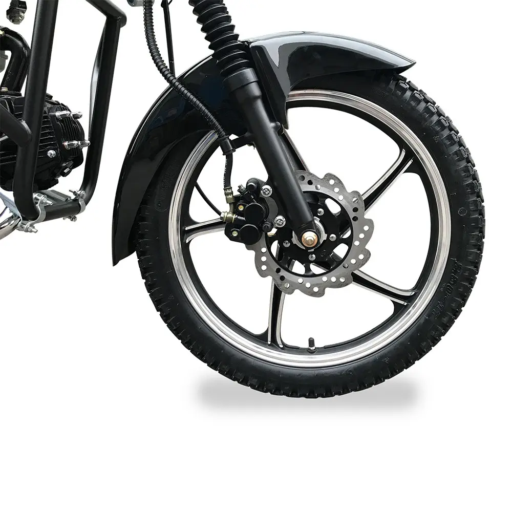 - Переднє колесо R: 2.50-17 Алюмінієві легкосплавні, п'ятиспицеві, пофарбовані матовою порошковою емаллю чорного кольору.