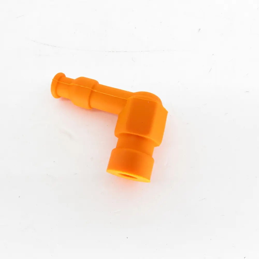 Яскравий помаранчевий колір надсвічника МРМ не лише привертає увагу, але й служить візуальним маркером тюнінгового компонента. Цей відтінок ідеально пасує до спортивних мотоциклів, кросових моделей або тих, чиї власники прагнуть додати агресивний та стильний елемент до свого байка. Помаранчевий колір легко інтегрується з іншими тюнінговими деталями або може виступати як яскравий акцент на тлі темних елементів двигуна. Конструкція під кутом 90° є надзвичайно важливою для багатьох моделей мотоциклів, особливо там, де простір навколо свічки запалювання обмежений. Такий кут забезпечує оптимальне укладання високовольтного дроту, запобігаючи його перегинам, тертю об рухомі або гарячі частини двигуна. Це не тільки продовжує термін служби дроту, але й запобігає можливому пробою ізоляції, що є критично важливим для безперебійної роботи двигуна. Ергономічний дизайн надсвічника також спрощує його встановлення та обслуговування, роблячи процес більш швидким та зручним для будь-якого мотоцикліста.