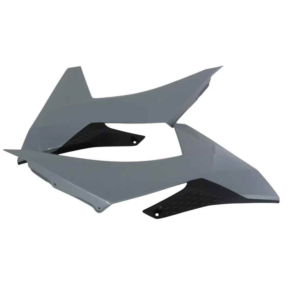 Для виготовлення цих пластикових елементів використовується високоякісний, ударостійкий ABS-пластик або аналогічний полімер, що забезпечує виняткову міцність та гнучкість. Це робить їх стійкими до значних механічних навантажень, які є характерними для експлуатації мотоцикла в складних умовах бездоріжжя, мотокросу або ендуро. Матеріал стійкий до ультрафіолетового випромінювання, що є критично важливим для збереження зовнішнього вигляду та структурної цілісності. Ця властивість запобігає вигоранню кольору та деградації структури пластику під впливом інтенсивного сонячного світла, що дозволяє зберігати сірий колір насиченим та рівномірним протягом багатьох сезонів.