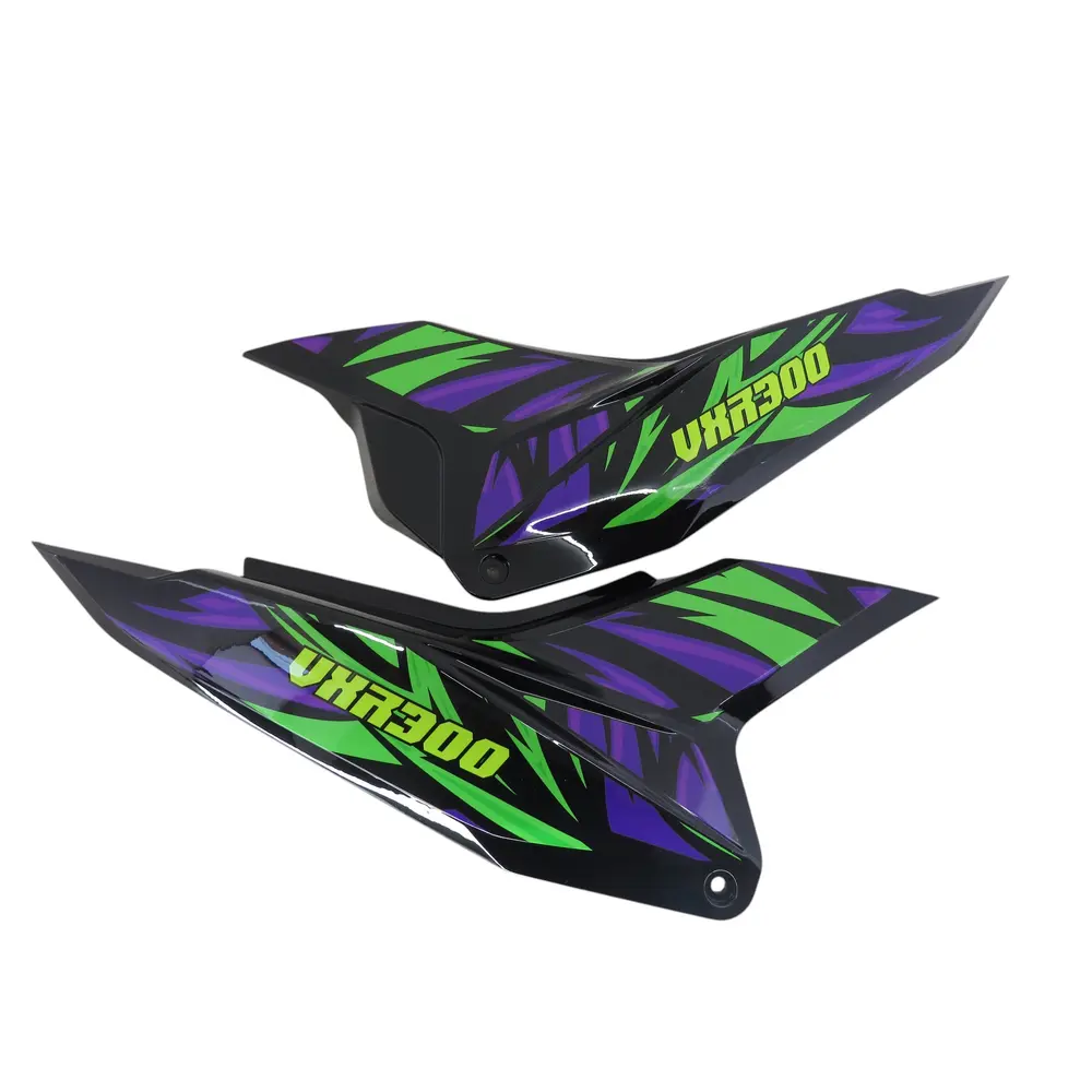 Виготовлений із міцного та ударостійкого ABS-пластику, цей комплект бічних панелей гарантує високу стійкість до механічних пошкоджень, таких як удари, подряпини та відколи, які неминучі при активній експлуатації мотоцикла в умовах бездоріжжя чи міських джунглів. Матеріал має відмінну еластичність, що дозволяє йому витримувати значні навантаження без руйнування, тим самим забезпечуючи тривалий термін служби. Спеціальна обробка пластику забезпечує його стійкість до впливу ультрафіолетового випромінювання, запобігаючи вигоранню кольору та збереженню інтенсивного зеленого відтінку протягом усього періоду експлуатації. Це означає, що ваш VXR 300 завжди виглядатиме свіжим та доглянутим, незважаючи на погодні умови та інтенсивність використання. Крім того, гладка поверхня пластику легко очищається від бруду та пилу, спрощуючи догляд за мотоциклом.