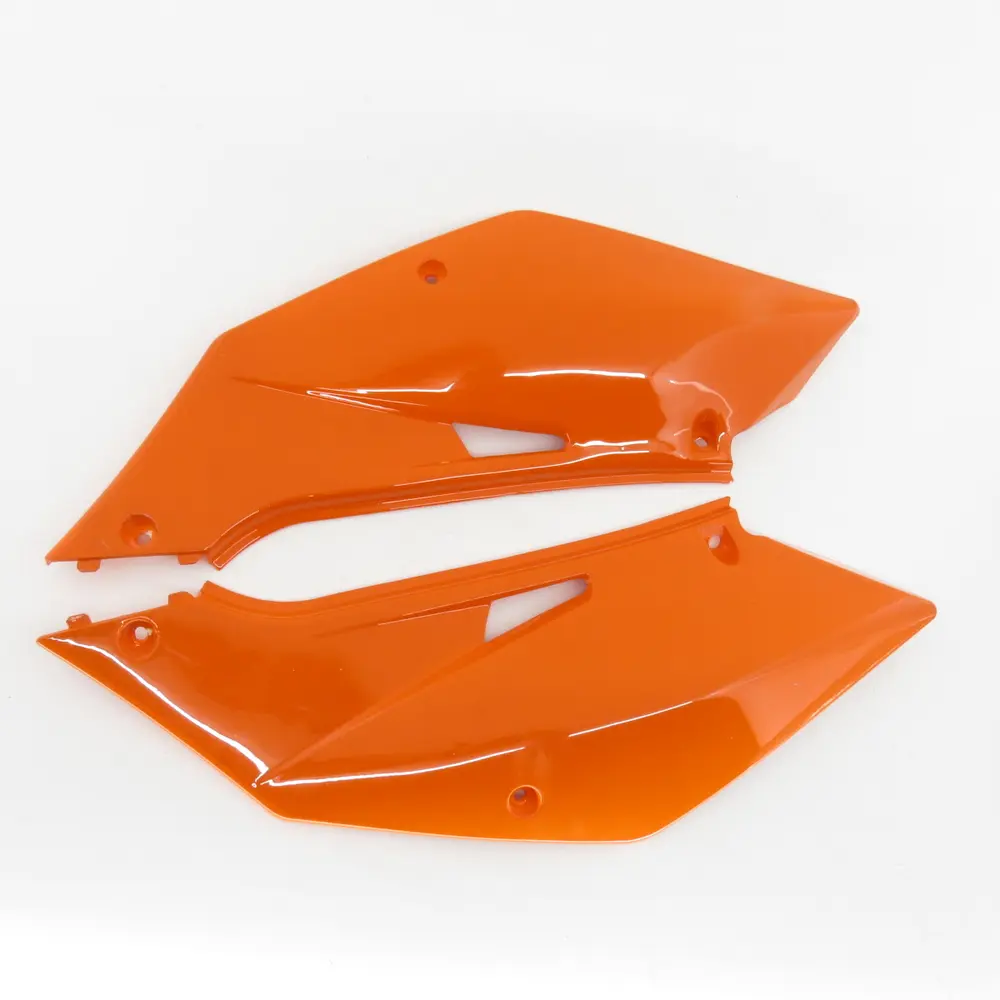 Даний комплект пластику виготовлений з високоякісних полімерних матеріалів, які відрізняються підвищеною міцністю, гнучкістю та стійкістю до зовнішніх факторів. Це гарантує довготривалу експлуатацію деталі навіть в умовах інтенсивного використання та різних погодних умов. Матеріал стійкий до ультрафіолетового випромінювання, що запобігає вигоранню та втраті насиченості помаранчевого кольору з часом. Він також добре переносить перепади температур, не тріскається на морозі та не деформується під впливом високих температур. Ударостійкість матеріалу допомагає витримати легкі зіткнення та падіння, мінімізуючи пошкодження основних елементів мотоцикла. Купуючи пластик у Motomarket, ви можете бути впевнені у відповідності запчастини стандартам якості та її довговічності.