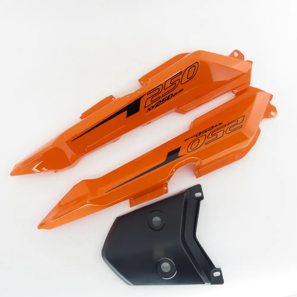 Даний комплект бічного заднього пластику розроблений з урахуванням усіх конструктивних особливостей мотоциклів Shineray XY200/250GY-9A. Він ідеально підходить за розмірами, формою та місцями кріплення, що гарантує легкість установки та відсутність необхідності в доопрацюванні. Високоякісний пластик, з якого виготовлені ці деталі, відрізняється підвищеною міцністю та стійкістю до механічних пошкоджень, ультрафіолетового випромінювання та температурних перепадів. Помаранчевий колір не тільки надає мотоциклу яскравості та помітності, але й виконаний з використанням стійких пігментів, які зберігають свою насиченість протягом тривалого часу, не вицвітаючи на сонці та не втрачаючи свого первісного блиску. У комплект входять ліва та права панелі, що дозволяє замінити обидві сторони одночасно, забезпечуючи ідеальне поєднання кольору та стану, що критично важливо для цілісного вигляду вашого байка.