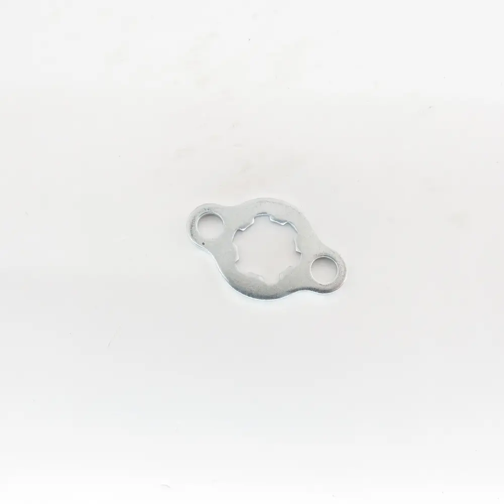 Пластина фіксуюча передньої зірки — це спеціально розроблений компонент, головне завдання якого полягає у надійній фіксації ведучої (передньої) зірки на валу двигуна. Без цієї пластини зірка могла б зміщуватися або навіть повністю зіскочити з валу під час руху, що призвело б до втрати приводу, пошкодження ланцюга та інших частин трансмісії, а також створило б вкрай небезпечну ситуацію на дорозі. Вона є бар'єром проти ослаблення кріплення, спричиненого вібраціями, ударними навантаженнями та постійними змінами крутного моменту. Таким чином, пластина забезпечує не тільки безперервність передачі руху, але й суттєво підвищує загальну безпеку експлуатації мотоцикла.