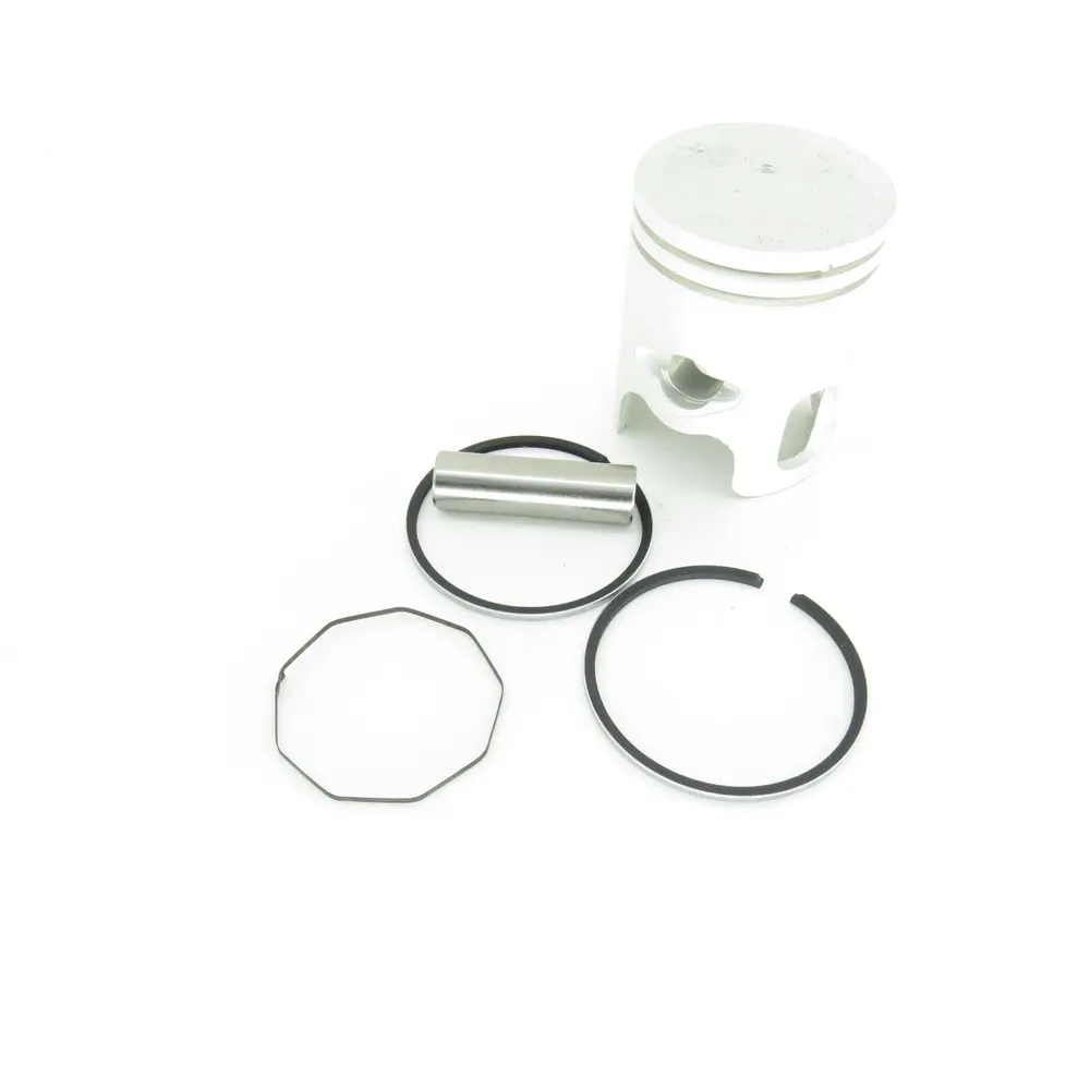 Серцем комплекту є високоміцний поршень, виготовлений з легкого алюмінієвого сплаву, що забезпечує відмінне співвідношення міцності до ваги. Це дозволяє зменшити інерційні навантаження та сприяє швидшому набору обертів двигуна. Спеціальна обробка поверхні поршня підвищує його зносостійкість та покращує властивості ковзання в циліндрі, мінімізуючи тертя та нагрів. Точна геометрія поршня, враховуючи необхідні теплові зазори, гарантує оптимальне розширення при робочих температурах, запобігаючи заклинюванню та забезпечуючи стабільну роботу. Конструкція поршня оптимізована для ефективного тепловідведення, що є критично важливим для двотактних двигунів, які працюють на високих обертах. Наявність спеціальних вікон та проточок забезпечує ефективне змащування та охолодження спідниці поршня, а також правильний розподіл потоків паливно-повітряної суміші в камері згоряння для максимально повного її згоряння.