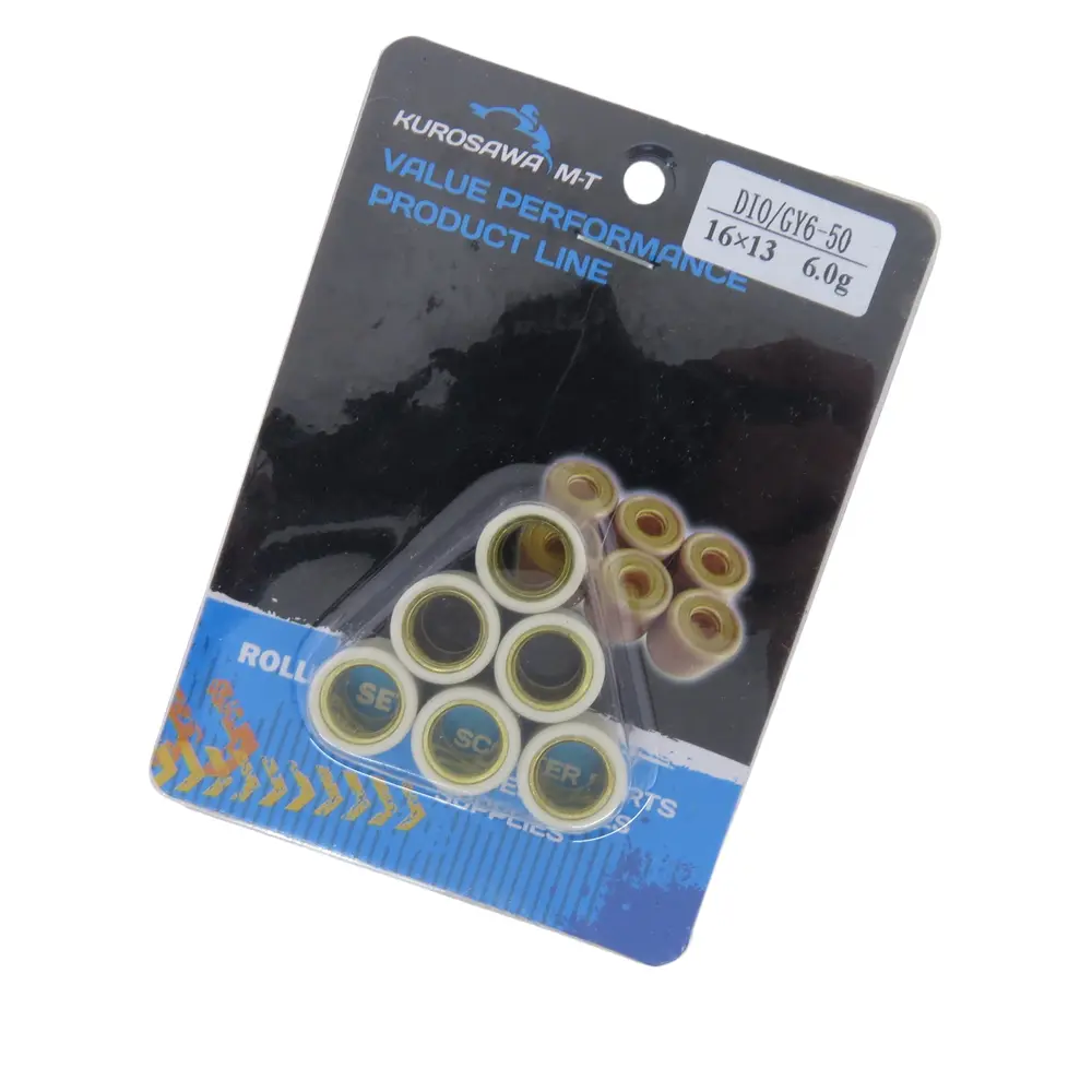 Розміри роликів варіатора – 16 мм у діаметрі та 13 мм у довжину – є стандартними для багатьох моделей варіаторів скутерів HONDA DIO та GY6-50. Точне дотримання цих параметрів є критично важливим для коректної роботи всієї варіаторної системи. Неправильні розміри роликів можуть призвести до їхнього заклинювання, надмірного зносу посадкових місць у варіаторі, пошкодження інших компонентів трансмісії або ж до неефективної роботи системи загалом, що виражається у втраті потужності та некоректному перемиканні. Ролики KUROSAWA MT виробляються з високою точністю, гарантуючи ідеальну відповідність розмірам та безперебійну роботу впродовж тривалого терміну служби. Це виключає будь-які люфти та забезпечує оптимальне та плавне переміщення роликів у своїх каналах, що є запорукою стабільної та ефективної роботи варіатора, а також мінімізує знос ременя та шківів.