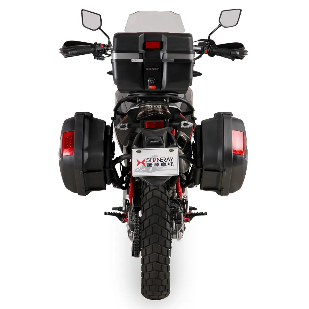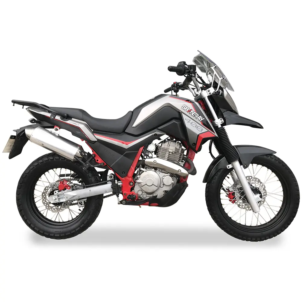 Shineray Elcrosso 400 привертає погляди своїм агресивним та сучасним дизайном, що одразу натякає на його позашляхові можливості. Високий кліренс, чіткі лінії кузова, інтегрована світлодіодна фара та мінімалістичний хвіст створюють образ справжнього авантюриста. Ергономіка мотоцикла продумана до дрібниць, забезпечуючи комфортну посадку як для коротких міських поїздок, так і для тривалих мандрівок. Широке кермо, зручне сидіння та оптимальне розташування підніжок дозволяють водію зберігати контроль та комфорт навіть на складних ділянках шляху. Приладова панель, виконана у сучасному цифровому стилі, надає всю необхідну інформацію – швидкість, оберти, рівень палива, вибрана передача – легко читається в будь-яких умовах освітлення, підвищуючи безпеку та зручність експлуатації.