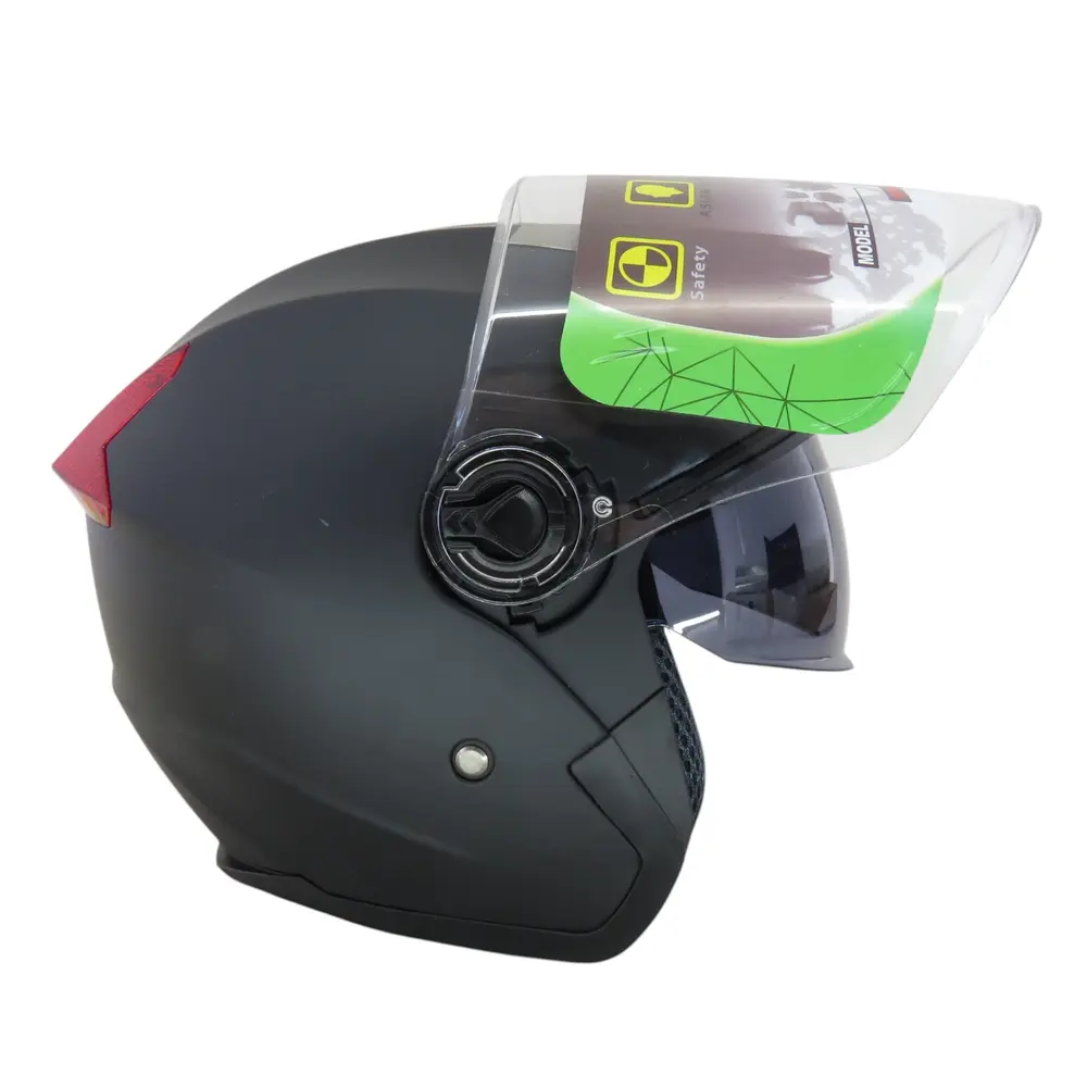Шолом 858 привертає погляди своїм глибоким чорним матовим кольором, який додає йому стриманої елегантності та сучасної агресивності. Матове покриття не тільки виглядає стильно та дорого, але й має практичні переваги: воно менш схильне до появи дрібних подряпин та відблисків від сонця, що дозволяє шолому довше зберігати свій первісний вигляд навіть за інтенсивного використання. Відкритий дизайн дарує неперевершене відчуття свободи, дозволяючи насолоджуватися вітром та запахами дороги, а також забезпечує максимальний кут огляду, що є критично важливим для безпеки у міському трафіку. Шолом 858 стане ідеальним доповненням до вашого образу, незалежно від того, чи віддаєте ви перевагу класичним чопперам, динамічним скутерам або іншим типам мототехніки, представленої в Motomarket.
