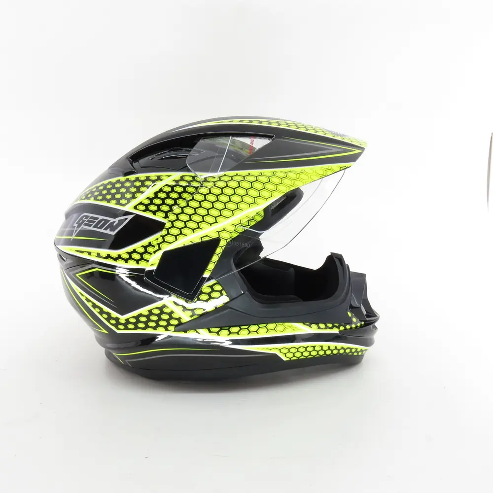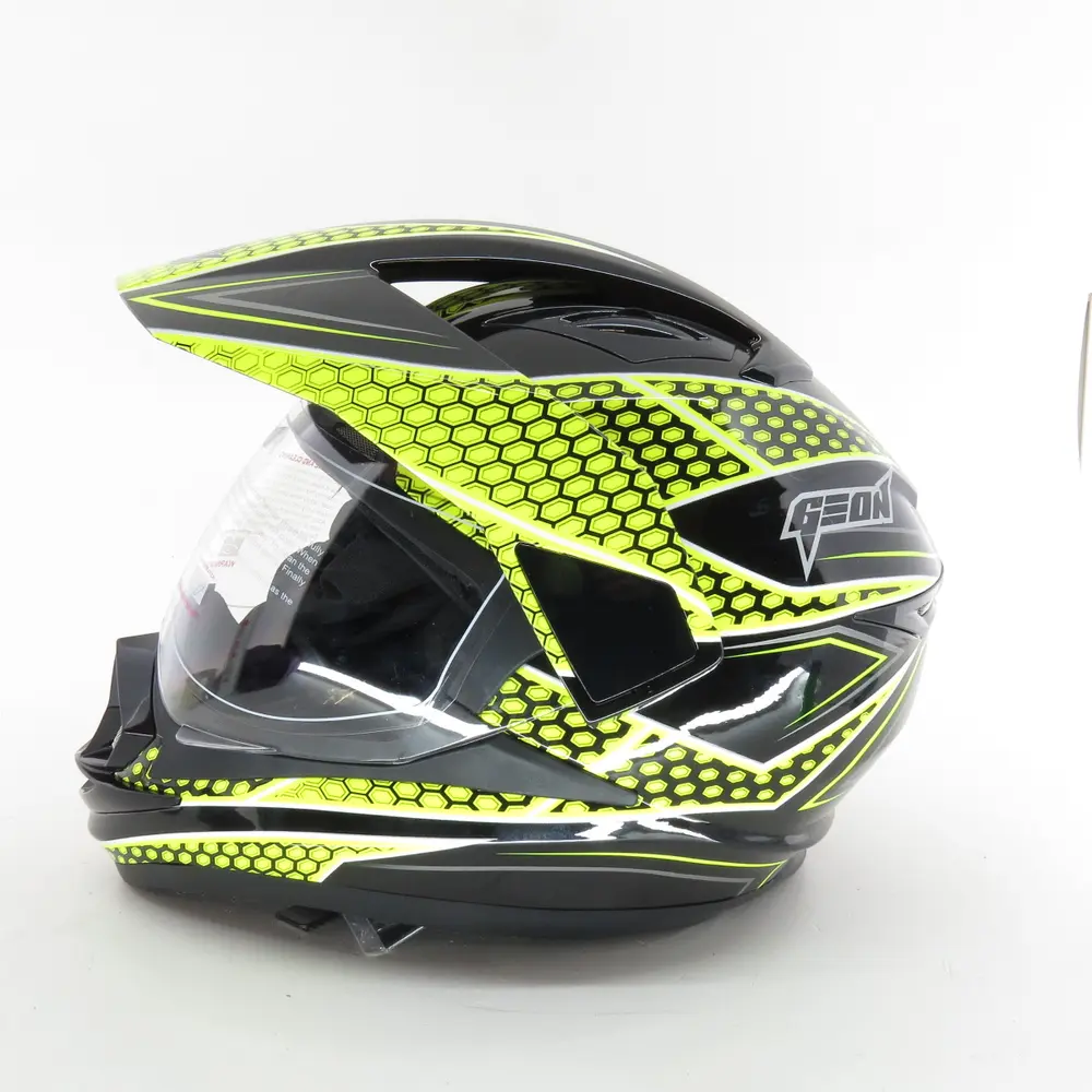 Дизайн Trek Black Yellow – це не просто яскрава кольорова гама. Це відображення духу пригод, динамічності та сучасності. Комбінація чорного та жовтого кольорів забезпечує відмінну видимість на дорозі, підвищуючи пасивну безпеку, а стильні графічні елементи роблять шолом справжнім акцентом вашого мотоциклетного образу, виділяючи вас з натовпу. Можливість використання мотоокулярів разом з візором або замість нього є ще однією перевагою, що розширює функціональність шолома для найхардкорніших позашляхових пригод, дозволяючи райдеру вибирати найбільш зручний варіант захисту очей залежно від інтенсивності та умов їзди. Ця гнучкість робить Geon 714 ідеальним вибором для будь-якого сценарію використання.