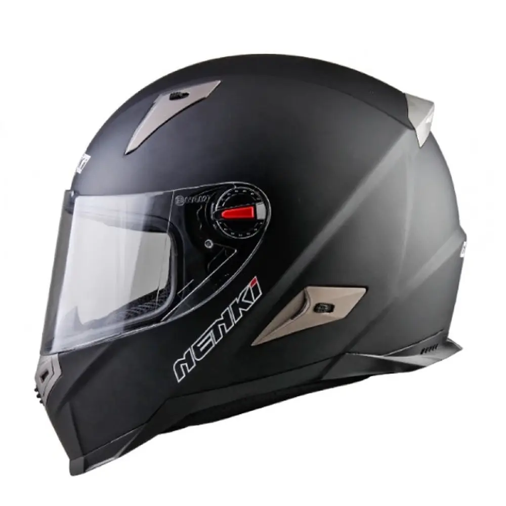 Шолом Nenki FF-863 відноситься до типу "інтеграл" (full-face), що забезпечує повний захист обличчя та підборіддя, а також бічних частин голови. Це найбезпечніший тип шоломів для мотоциклістів, оскільки він повністю закриває голову райдера, мінімізуючи ризик травм при падіннях. Корпус шолома виготовлений з високоміцного термопластичного матеріалу, який відзначається відмінною стійкістю до ударів та абразивного зносу. Цей матеріал ефективно поглинає енергію удару, розподіляючи її по всій поверхні шолома, тим самим значно знижуючи навантаження на голову та мозок. Внутрішній шар шолома складається з багатошарового EPS (пінополістиролу) різної щільності, що забезпечує оптимальне поглинання енергії в різних зонах удару, пропонуючи прогресивний захист при різних рівнях інтенсивності удару. Шолом Nenki FF-863 розроблений та протестований з урахуванням найвищих міжнародних стандартів безпеки, таких як ECE R22.05, що підтверджує його надійність та відповідність жорстким вимогам європейського законодавства. Надійна система застібки мікрометричного типу гарантує швидке та безпечне фіксування шолома на голові, а також легкість зняття. Ця система дозволяє точно регулювати натяг, забезпечуючи щільне та комфортне прилягання, що є критично важливим для утримання шолома на місці під час аварії.