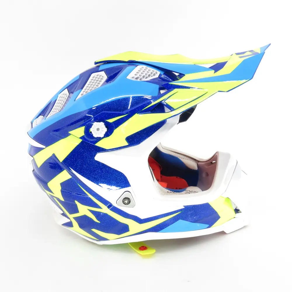 Зовнішній вигляд LS2 MX470 Subverter – це втілення агресії та швидкості. Його унікальні та футуристичні лінії не тільки приваблюють погляди, але й оптимізовані для аеродинамічної ефективності, забезпечуючи стабільність на високих швидкостях та зменшуючи вітрове навантаження. Регульований козирок ефективно захищає від сонця, бруду та бризок, а його конструкція дозволяє легко налаштовувати кут нахилу. Широкий оглядовий виріз гарантує максимальне поле зору та ідеальну сумісність з більшістю мотокросових окулярів, дозволяючи вам чітко бачити кожну перешкоду на шляху. Яскраві графічні елементи NIMBLE у біло-синьо-жовтих тонах не лише підкреслюють сучасний стиль, але й підвищують вашу помітність на трасі.