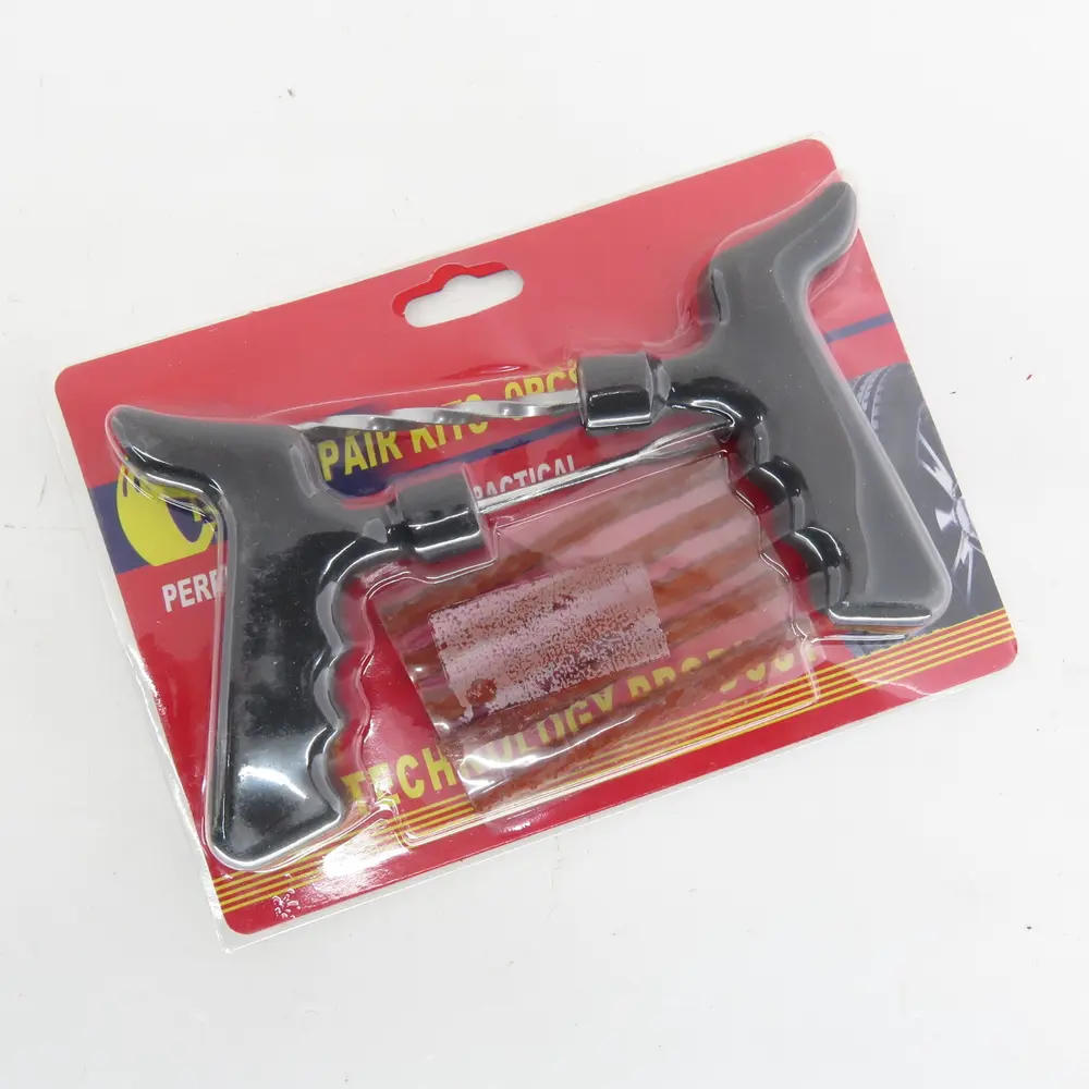 - П'ять високоякісних ремонтних латок (джгутів): Ці спеціальні гумові джгути є основою для усунення проколу. Вони виготовлені з міцного та еластичного бутил-каучуку, який забезпечує герметичне закриття отвору, запобігаючи подальшому витоку повітря. Вони ідеально інтегруються в структуру шини, забезпечуючи надійний, хоч і тимчасовий, ремонт. П'ять латок гарантують, що у вас буде достатній запас для кількох ремонтів або для повторної спроби, якщо перший раз не вдалося ідеально закрити прокол.