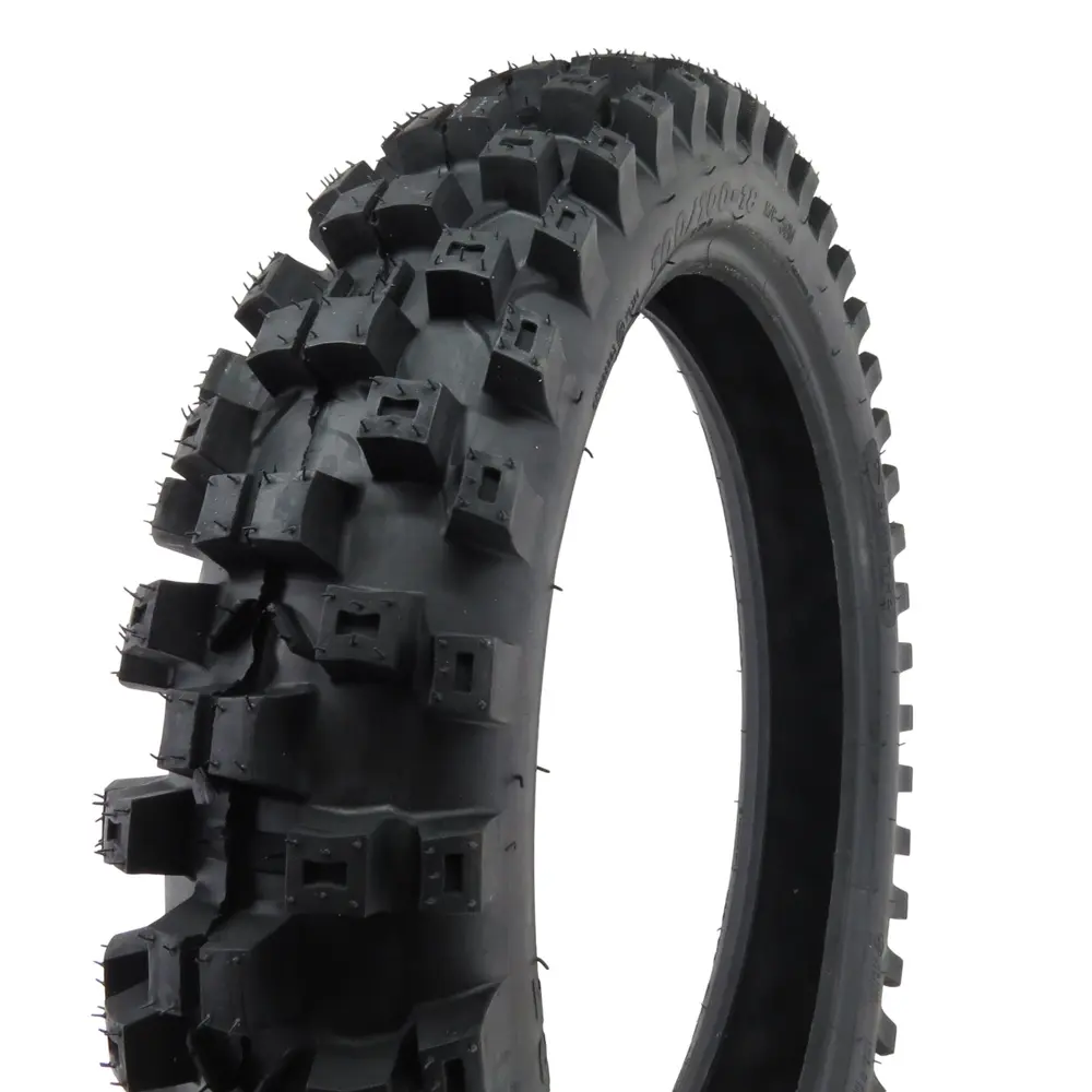 Розмір 100/100 -18 TT є стандартним для багатьох кросових мотоциклів та мотоциклів для ендуро. Число "100" перед дробом вказує на ширину шини в міліметрах. Друге число "100" після дробу означає співвідношення висоти профілю шини до її ширини у відсотках. У даному випадку це 100%, що робить шину "повнопрофільною", тобто її висота дорівнює ширині. Такий профіль забезпечує збільшений об'єм повітря всередині шини, що дозволяє їй краще "ковтати" нерівності траси, пом'якшуючи удари та покращуючи комфорт райдера. Це також сприяє більшому зчепленню завдяки більшій плямі контакту з поверхнею. "18" вказує на діаметр обода в дюймах, що є стандартним для задніх коліс позашляхових мотоциклів, забезпечуючи оптимальний баланс між міцністю, прохідністю та маневреністю. Літери "TT" означають "Tube Type" – камерний тип шини. Це означає, що для її використання необхідна внутрішня камера. Камерні шини часто віддають перевагу в умовах екстремального бездоріжжя, оскільки вони можуть бути легшими в ремонті у польових умовах, а також забезпечують певну гнучкість при роботі з низьким тиском для максимального зчеплення.