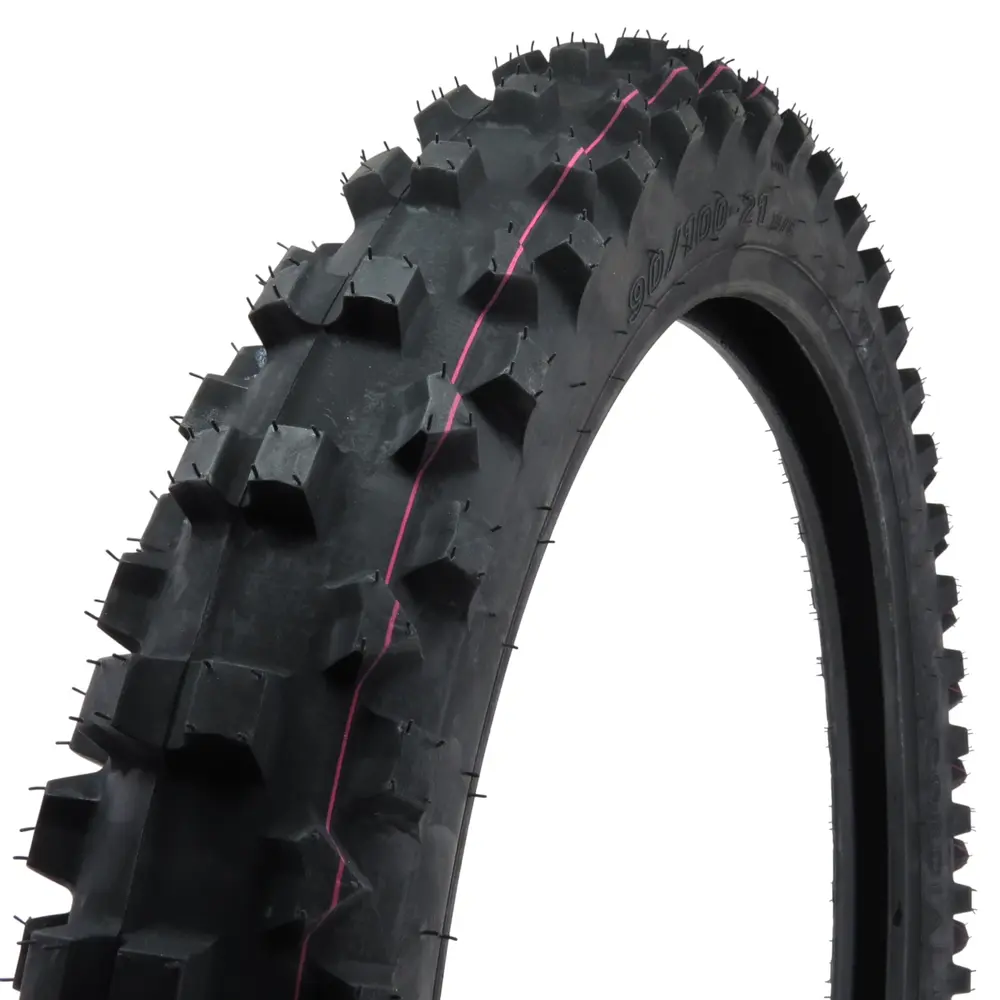 - Розмірність 90/100-21: Цей розмір є стандартом для передніх коліс багатьох ендуро та кросових мотоциклів. Ширина 90 мм забезпечує відмінну маневреність та точність керування, а високий профіль 100% (відношення висоти до ширини) додає амортизаційних властивостей, що критично важливо при подоланні перешкод та пом'якшенні ударів. 21-дюймовий діаметр дозволяє легко перекочуватися через нерівності та каміння, покращуючи прохідність.