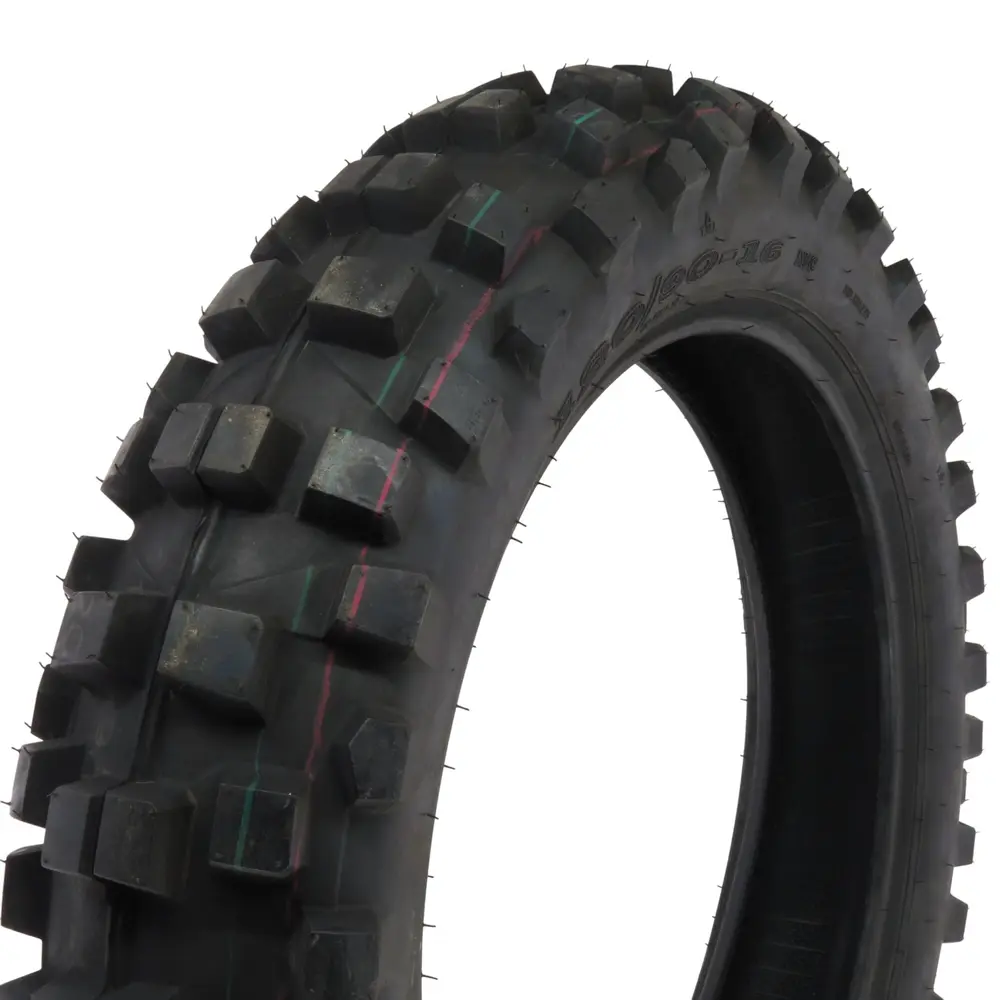 - 90% – це відношення висоти профілю до ширини шини. Високий профіль (90%) є характерним для мотошин класу ендуро та крос, оскільки він забезпечує кращу амортизацію ударів та вібрацій, що є критично важливим при їзді по бездоріжжю та нерівним дорогам. Він також дає додатковий захист обода від пошкоджень, збільшуючи життєвий цикл колеса в цілому. Це сприяє комфортнішій їзді та кращому проходженню перешкод, роблячи довгі поїздки менш стомлюючими.
