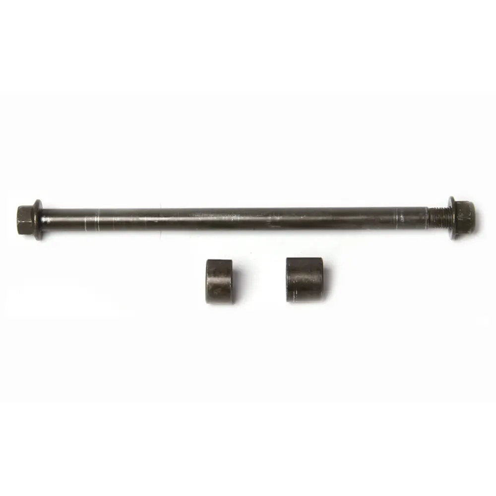 Даний комплект включає в себе вісь заднього колеса, а також ліву та праву втулки, які є невід'ємними частинами системи кріплення колеса. Вісь виконує функцію центрального елемента, що фіксує колесо у маятнику, забезпечуючи його правильне розташування та обертання. Втулки ж, у свою чергу, слугують для зменшення тертя між віссю та іншими елементами, такими як підшипники та маятник, а також для компенсації можливих люфтів, що виникають під час експлуатації. Вони забезпечують плавність ходу, зменшують знос суміжних деталей та значно продовжують термін служби всієї задньої підвіски.
