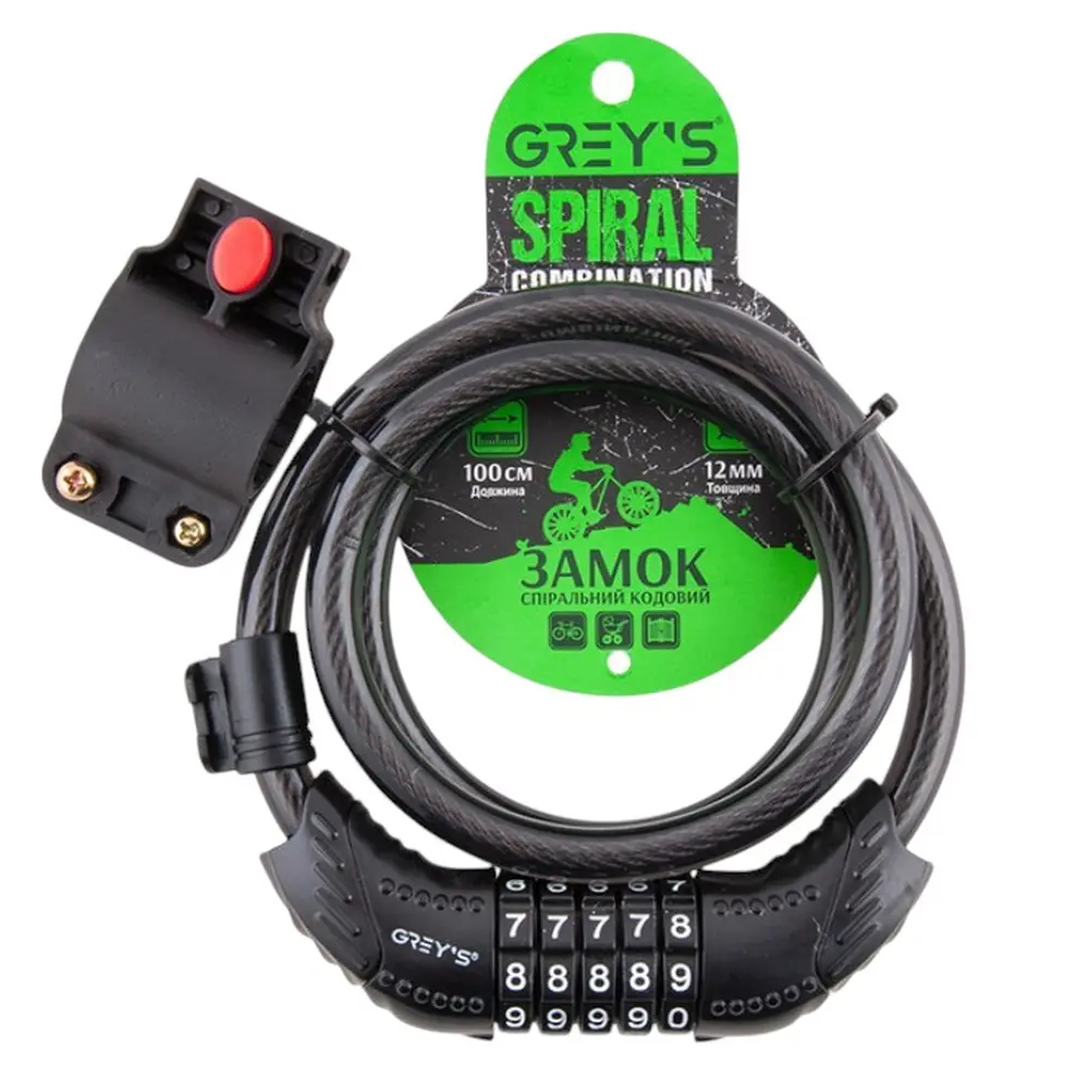 Замок велосипедний Grey`s спіральний кодовий з кріпленням 12*1000 мм: Надійний захист вашого двоколісного друга