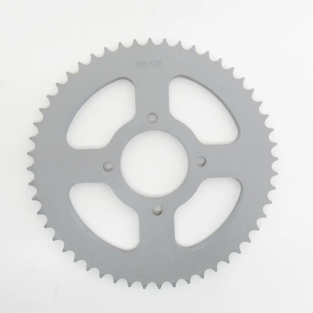 - Оптимізована продуктивність: 52 зуби забезпечують покращену тягу та динаміку розгону, що особливо помітно при старті з місця, на підйомах або при русі з пасажиром. Це ідеальний баланс для мотоциклів 125-150 куб.см, які використовуються в різноманітних умовах експлуатації.